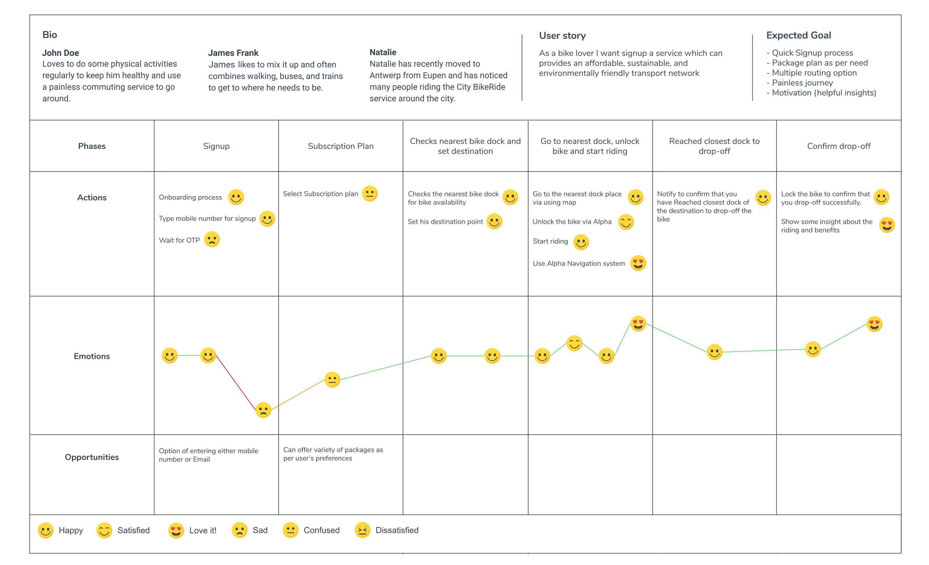 Our persona hypothesis consisted of three different archetypes which we used to facilitate discussions about our users’ needs, desires, and varying contexts of use. Through careful analysis of our research, we identified sufficient behavioral variables to segment our user audience. These variables could be categorized into activities such as frequency of use of the scheme, skills such as riding confidence, and motivations such as reasons for cycling.